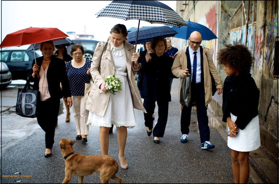 Recordo-me, em particular, de um dia cinzento, envolvido por uma chuva miudinha. Daquelas que, ao início, parecem inofensivas, mas que passados alguns passos transformam o fotógrafo de casamento num aventureiro encharcado.